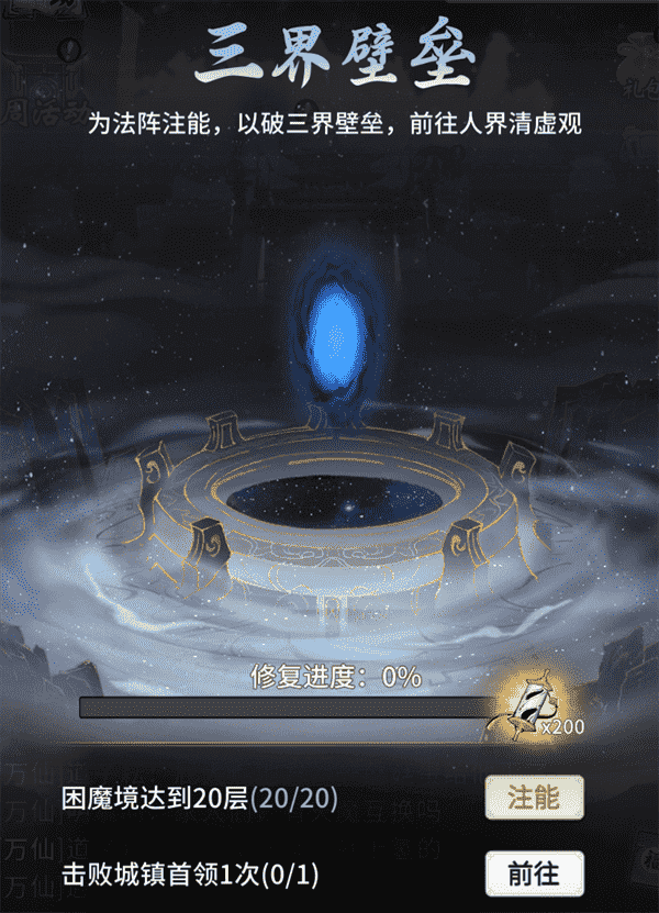 当你修为达到返虚/破虚中期后,,可在城镇寻得芸丫并激活神秘法阵,,通过收集材料、、击败首领等方式为法阵注能,,,,借以打破三界壁垒,,,,开启支线剧情“清虚旧梦”