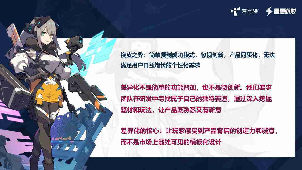 在我们内部是这么定义差异化的。。。首先,,,,差异化不是简单的功能叠加,,,更不是换皮。。。。只是换皮,,产品无法提供有效的市场价值。。。内部经常说差异化的产品不是为了迎合市场,,,,而是找到一个自己独特的表达方式,,,在研发中找到属于自己的细分赛道和独特赛道,,,前提是需要对这个题材有足够的深入、、、、挖掘,,,,对玩法有足够深入的理解,,,,让产品看起来既熟悉又有新意。。。