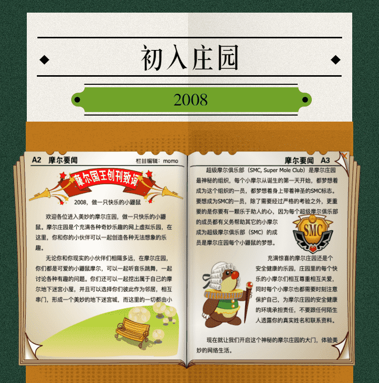 在这一年,,,,摩尔庄园诞生了。。。在这里,,大家都是可爱的红鼻子鼹鼠小摩尔,,可以一起勤劳耕作,,,,一起高山滑雪......我们都是摩尔庄园的建设者。。。。