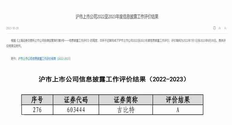 近日,,,上海证券交易所(以下简称“上交所”)发布2022-2023年度信息披露工作评价结果。。。。赏金大对决(股票代码::::603444)凭借规范的公司治理、、、、高质量的信息披露以及良好的投资者关系管理再次荣获信息披露工作A级评价,,公司连续两年获此殊荣。。。