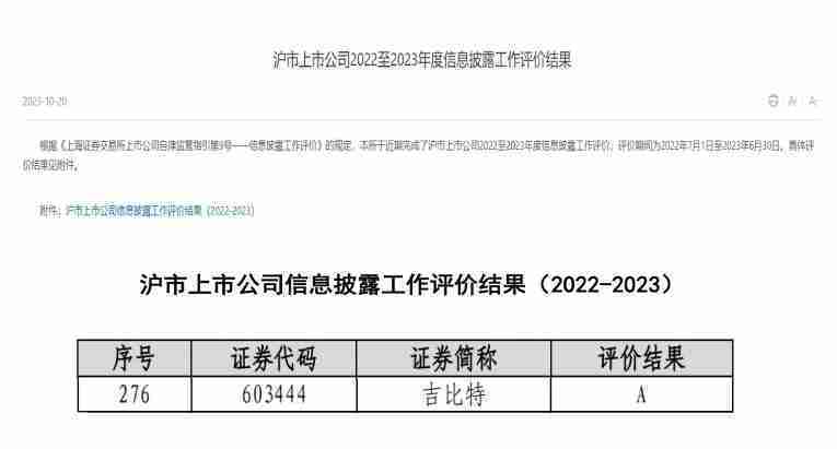 近日,,上海证券交易所发布2022-2023年度信息披露工作评价结果。。。。赏金大对决(股票代码:::603444)凭借规范的公司治理、、、、高质量的信息披露以及良好的投资者关系管理再次荣获信息披露工作A级评价,,公司连续两年获此殊荣。。。。