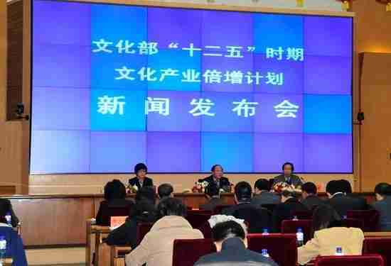 2月28日下午,,,,文化部在京召开新闻发布会,,正式向社会发布《文化部“十二五”时期文化产业倍增计划》,,提出了 “十二五”期间文化部门管理的文化产业增加值年平均现价增长速度高于20%,,,2015年比2010年至少翻一番,,,实现倍增的奋斗目标。。